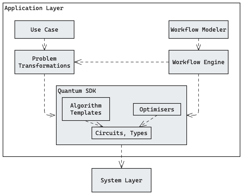 A lot of different software components exist that can be classified as part of the application layer and the above figure presents a rough sketch of their dependencies. Most quantum software that is freely available today makes use of (usually python-based) SDKs to build quantum circuits. Furthermore, many tools exist for transforming various scientific, engineering and commercial problems into quantum formulations, and there exist several tools for configuring these transformations in a low-code manner. Fully developed quantum solutions will likely have to implement a custom component in the long term to interface between existing systems and the quantum software stack.