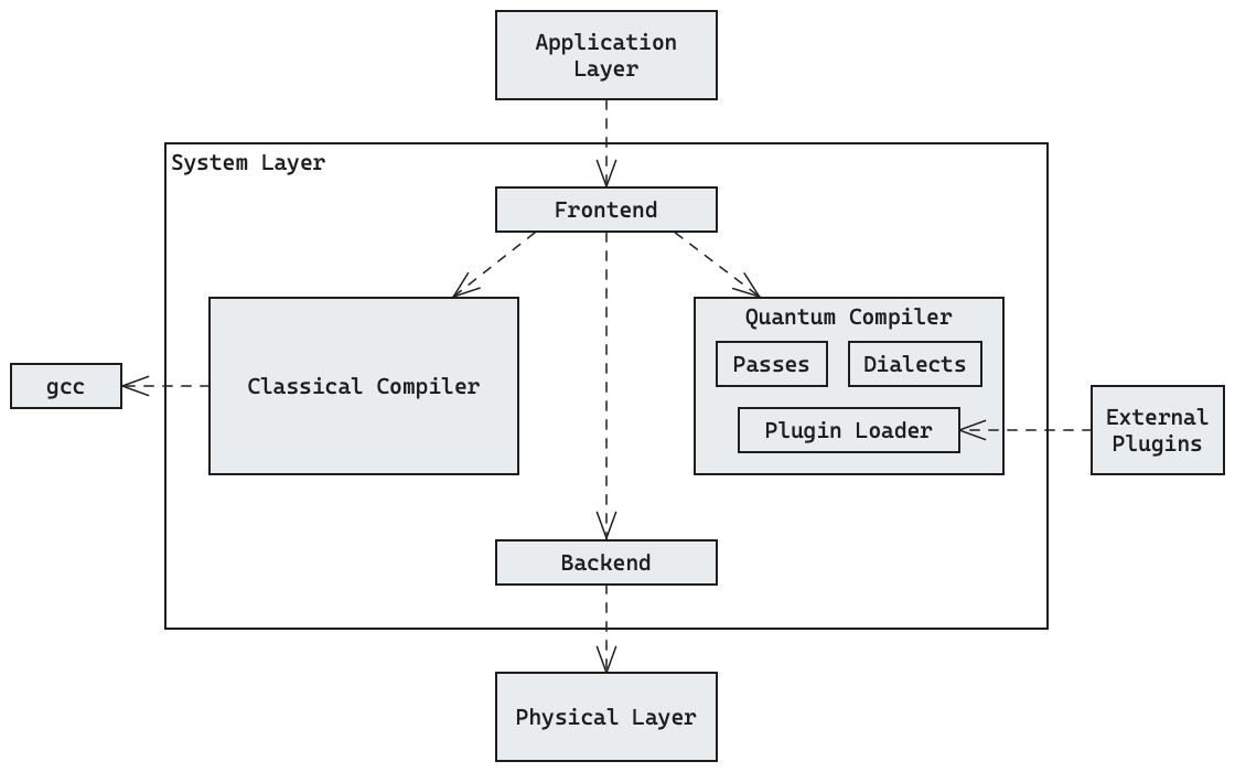 gcc's page on frontends), meaning frontends for different languages or SDKs could be integrated in the future. - Classical Compiler: Integrates established compiler infrastructure (e.g.